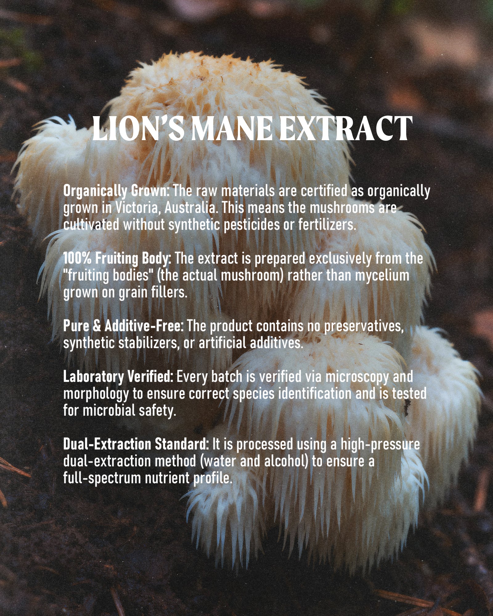 Organically grown in Victoria, Australia. Dual-extracted using hot water and 95% ethanol to capture the complete spectrum of beneficial compounds - including hericenones and erinacines that support Nerve Growth Factor production.